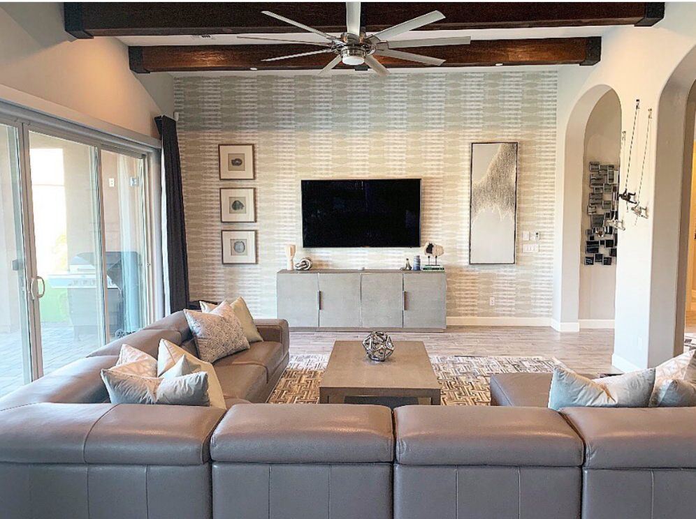 The generous living room offered plenty of space to work with. We selected custom artwork, bespoke wallpaper, and abstract décor elements to create a defining ambiance.